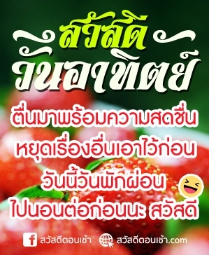 เป็นยังไงกันบ้างคะ สำหรับรูปสวัสดีวันอาทิตย์ ที่สอดแทรกคำอวยพร และรูปภาพผลไม้ และอาหาร ขนมไทย สุดน่ากิน น่าทาน สำหรับใครที่ชื่นชอบ สามารถโหลดไปส่งต่อกันได้ฟรีๆเลยนะคะ สุดท้ายขอผู้ที่เข้ามาเยี่ยมชมทุกท่าน มีความสุข ความเจริญ ร่างกายสุขภาพแข็งแรง และได้รับผลบุญจากไมตรีจิตร ที่นำไปส่งต่อความสุขให้คนอื่น ย้อนกลับมาเป็นพันเท่าเลยนะคะ อย่าลืมติดตามเว็บ PAKMUD.COM กันด้วยนะคะ รับรองว่าจะหาคอนเท้นดีๆมาลงให้ได้อ่านกันเรื่อยๆแน่นอนจ้า